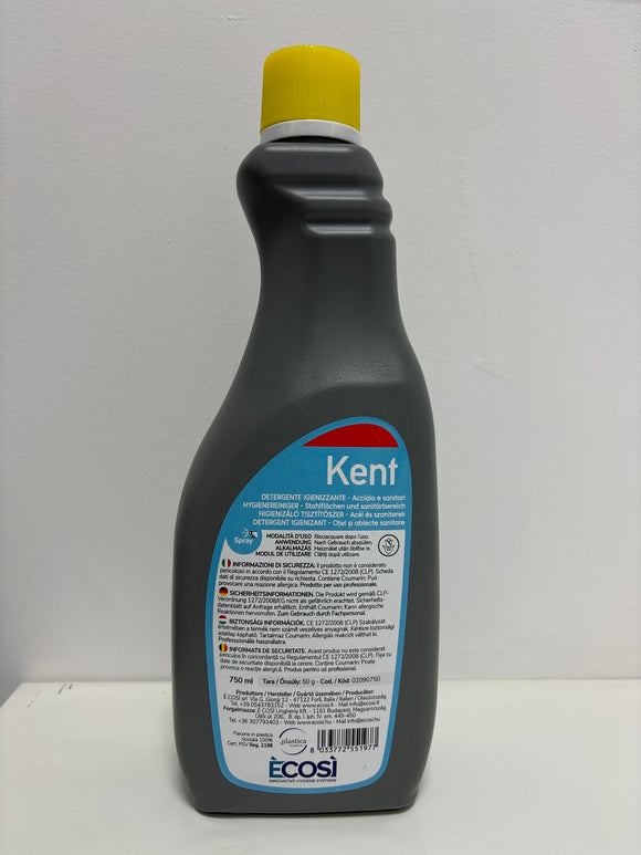 KENT è un detergente Profumato acido con effetto sgrassante, igienizzante ed anticalcare per sanitari, piastrelle e superfici in acciaio. Rimuove facilmente i residui grassi, il sapone ed il calcare e ne ritarda il rideposito. Le superfici rimangono brillanti, senza aloni e protette.
